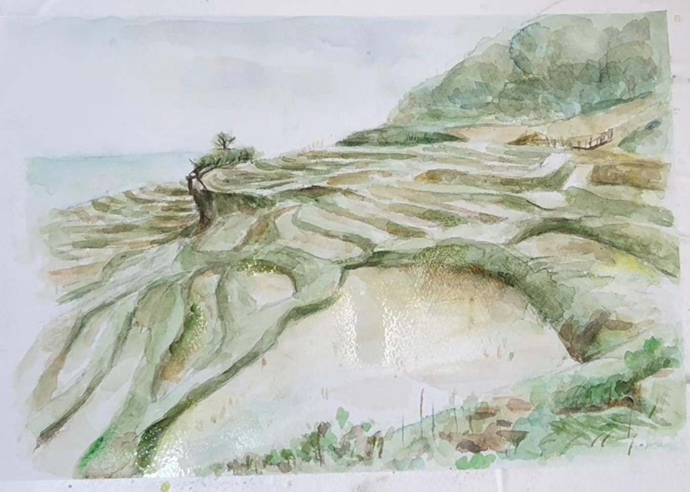 中景にある棚田はやや細かく描いていきます。色も遠景に比べてエッジをきかせて描きます。